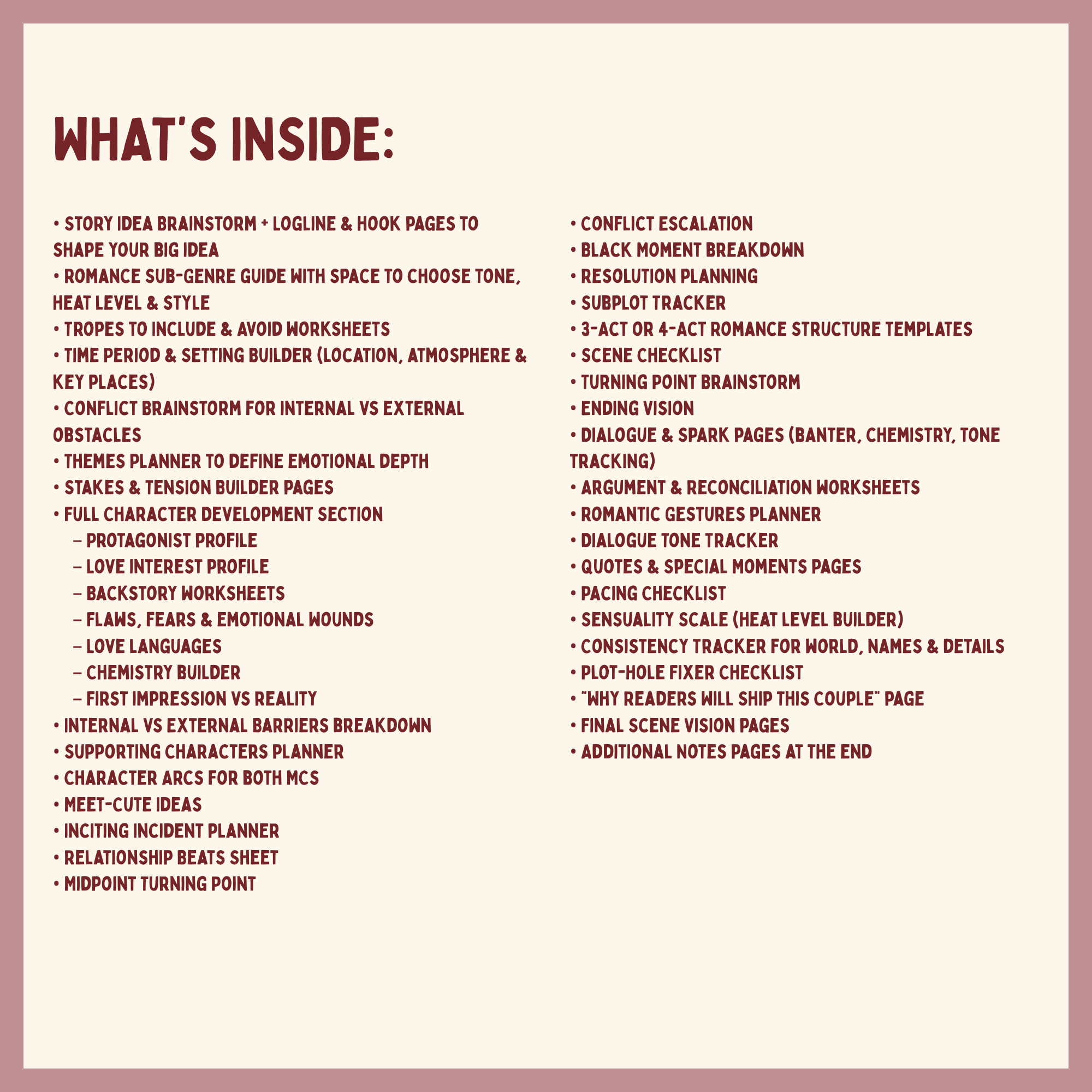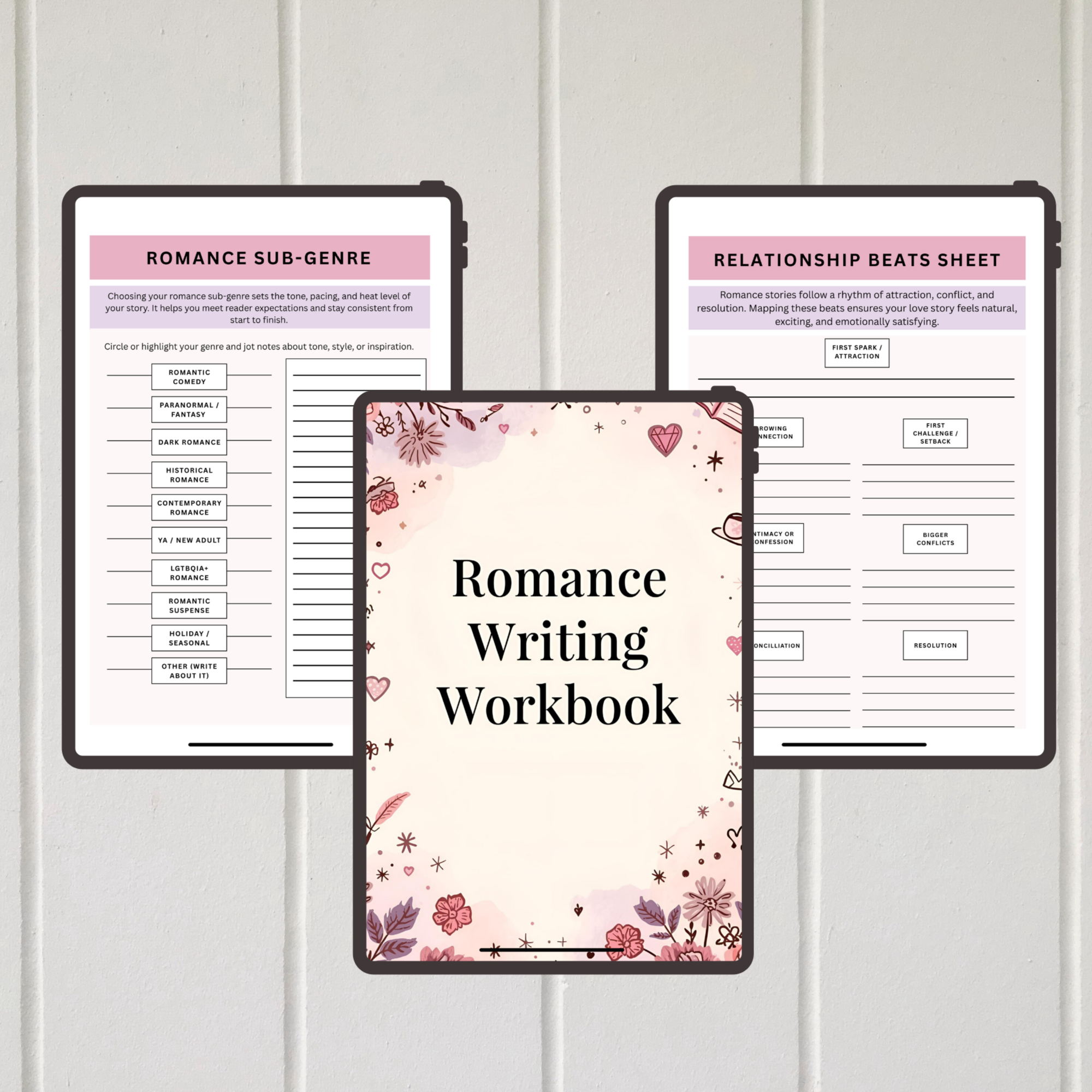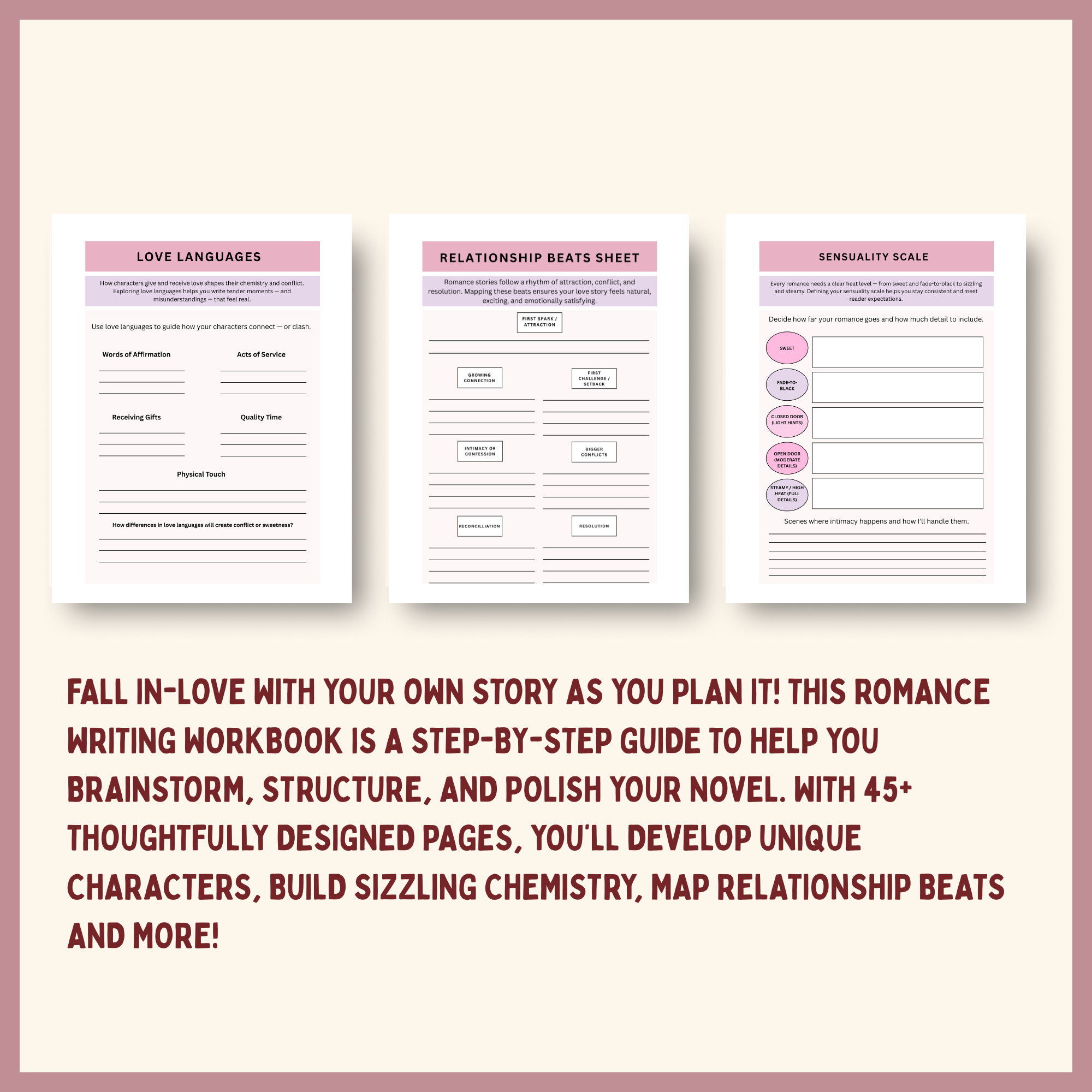 Fall in love with your own story as you plan it! This Romance Writing Workbook is a step-by-step guide to help you brainstorm, structure, and polish your novel. With 40+ thoughtfully designed pages, you’ll develop unique characters, build sizzling chemistry, map relationship beats, plan unforgettable dialogue, and shape an ending readers will swoon over.