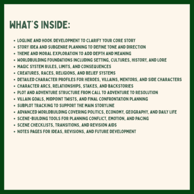 Step into your imagination and design the fantasy novel you’ve always dreamed of. This guided workbook takes you from worldbuilding and magic systems to unforgettable characters, epic quests, and powerful scenes — all with prompts, checklists, and creative trackers to keep your story clear, rich, and inspiring.